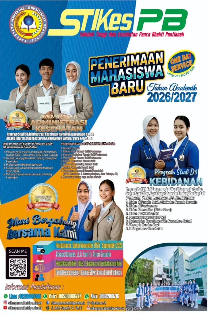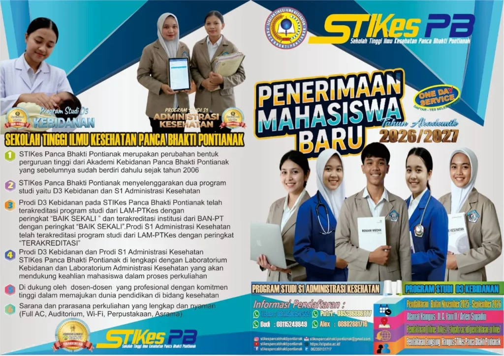 Selamat datang di STIKES Panca Bhakti Pontianak, tempat unggulan untuk mengejar mimpi di bidang kesehatan! Kami gembira mengumumkan penerimaan mahasiswa baru untuk tahun akademik 2026/2027, dan Anda bisa menjadi bagian dari perjalanan pendidikan berkualitas kami.
